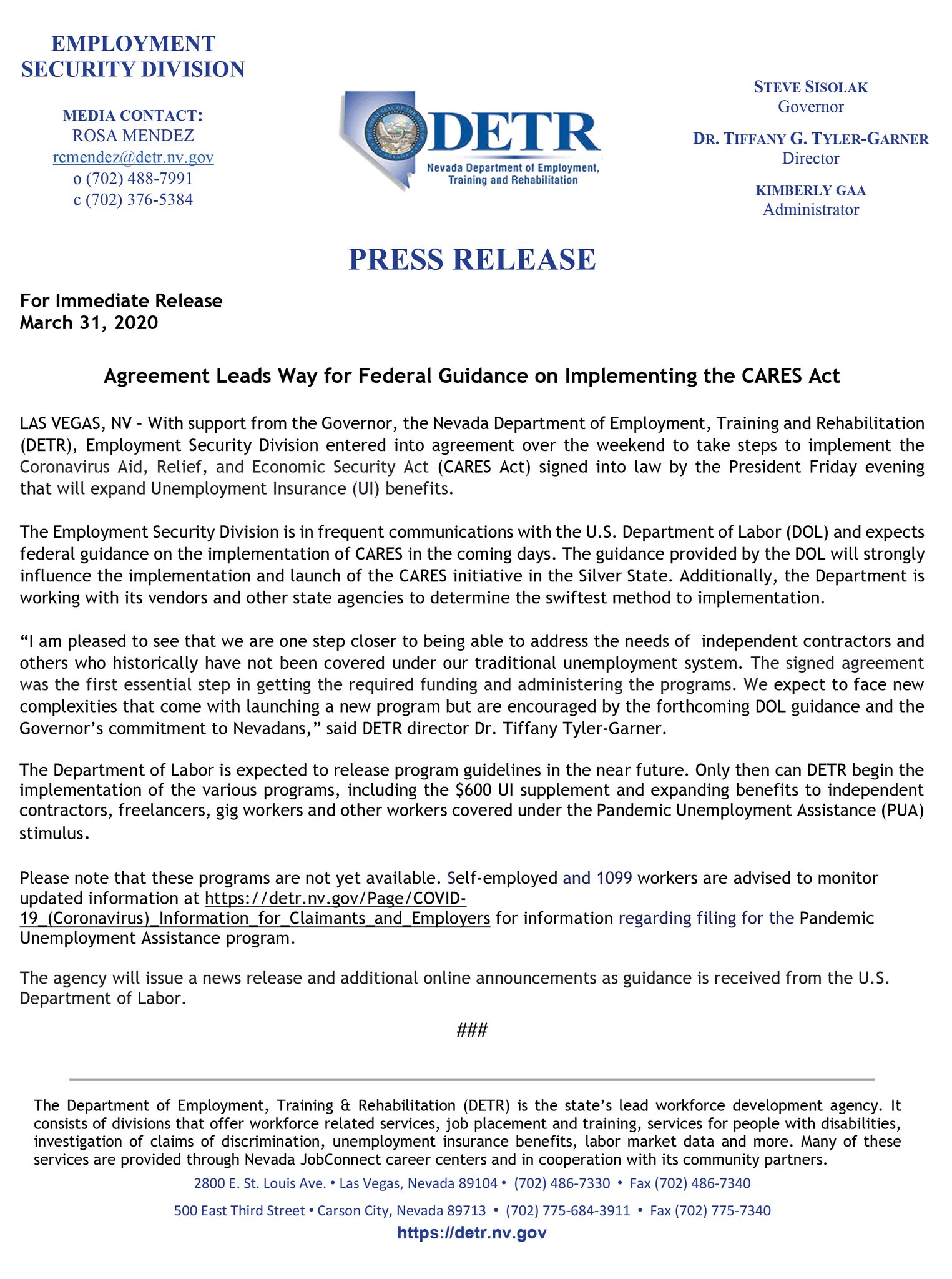 Twitter 上的 Detr Nvjobconnect The Detr Employment Security Division Entered Into Agreement Over The Weekend To Take Steps To Implement The Coronavirus Aid Relief And Economic Security Act Cares Act Signed Into Law